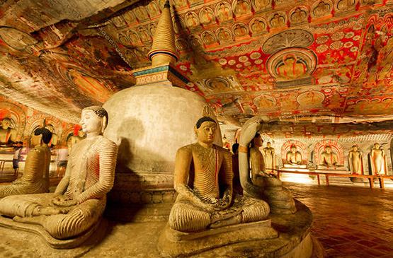 The beautiful Dambulla Cave Temple, the largest cave monastery in the country with a history going back the 1st century BC. Dambulla is famous for its rock paintings and is among the best preserved monastic temple cave complexes in Sri Lanka. There are about 150 Buddha statues with over 2000 square metres of painted walls and ceilings within a complex of five separate caves which also includes some Hindu deities.